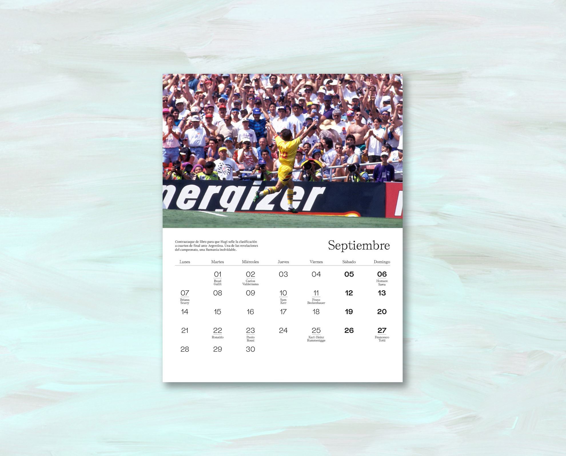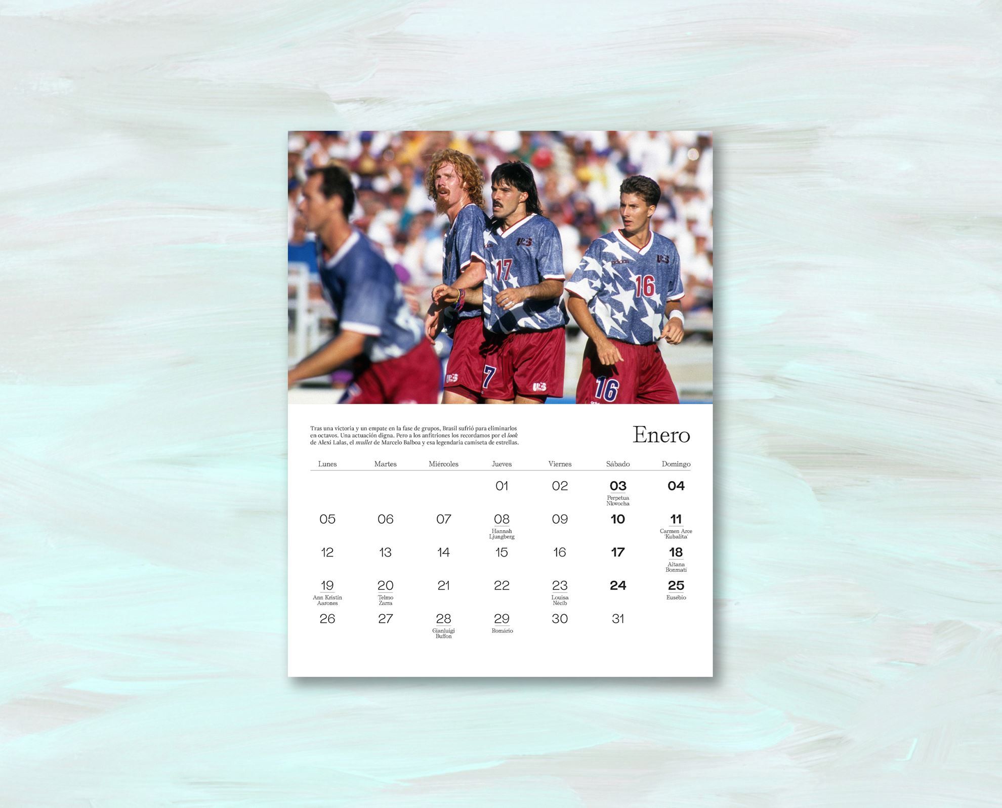 Calendario 2026, para colgar en la pared. Este año, en el que volveremos a disfrutar de un Mundial en EEUU, toca rememorar el Mundial'94 con imágenes míticas del torneo que marcó nuestra infancia. Y con el santoral de 100 iconos de la historia del fútbol: 50 jugadoras y 50 jugadores. -- Tamaño cerrado: 148x230mm. Tamaño abierto: 296x230mm.